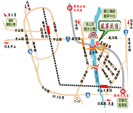 台九線北上蘇澳往羅東方向 → 於93.5K右轉珍珠一路 → 左轉富農路二段 → 右轉茄苳路 →