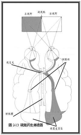 你一定很想知道为什么是这样吧?这就得从人类视觉讯息的神经通道谈起,如图2-13所示,当一个人双眼注视着视野中央的凝视点时,凝视点右边的讯息内容(或称右视野讯息)会落入两个眼球网膜视觉小窝(fovea)左侧的区域;相反地,在凝视点左边的视觉讯息(或称左视野讯息)则会落入两个眼球网膜视觉小窝(fovea)左侧的区域。视神经传送至“视交叉”后,视神经会重新组合,使得两个眼球视觉中窝右侧的视神经(即接受左视野内容的神经)传送至视丘中的侧膝核再进入右半脑枕叶的视觉皮质区。同理,在“视交叉”中,两个眼球视觉中窝左侧的视神经(即接受右视野内容的神经)传送至视丘中的侧膝核再进入左半脑枕叶的视觉皮质区。简而言之,在你凝视点右边的视觉讯息会先传递至左半脑的视觉皮质区,而凝视点左边的讯息则会先传至右半脑的视觉皮质区。