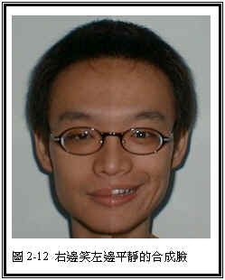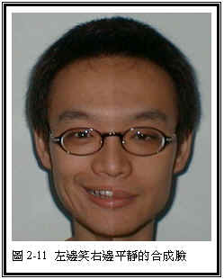 请看最下方的照片,这两张由同一个人不同表情的脸孔所合成的图片。其中,图2-11的脸孔左边是带有欢笑的表情的脸,右边是则是无表情变化的平静脸。反之,图2-12的脸孔中,左边是不带表情的平静脸,右边则是带有欢笑表情的脸。请问你会觉得那一张脸孔比较快乐吗?