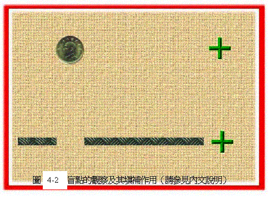 聪明的各位,请想想看:如何仅用眼睛就让钱币消失以及让两条断线接合起来?什么,你说你没有特异功能,不可能做到。事实上每个人都有办法做到。请闭上右眼,以左眼注视下图的上半部右方的十字型,并将图片置30公分远处,徐徐的往眼球移动,到了某一距离时,我们会发现左边的铜币不见了。这时,钱币的影像正好落在左眼的盲点上。但请注意,我们虽看不到钱币,但我们并不会觉得视野中有一个破洞存在,而是钱币的位置,被填上背景的颜色。现在请闭上右眼注视下图右下方的十字型,缓缓将图片由30公分向眼球移动,等到一特定点,左下方断掉的直线竟然接合起来了。奇妙吧!这是因为我们的视觉系统会依据盲点周遭的影像(直线)加以外衍以填满盲点的内容所致。这也就是为何我们平常无法发觉盲点存在的原因。